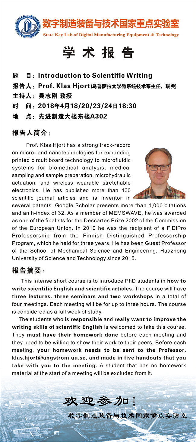 04.18/20/23/24 06:30PM 瑞典乌普萨拉大学Klas Hjort教授学术报告