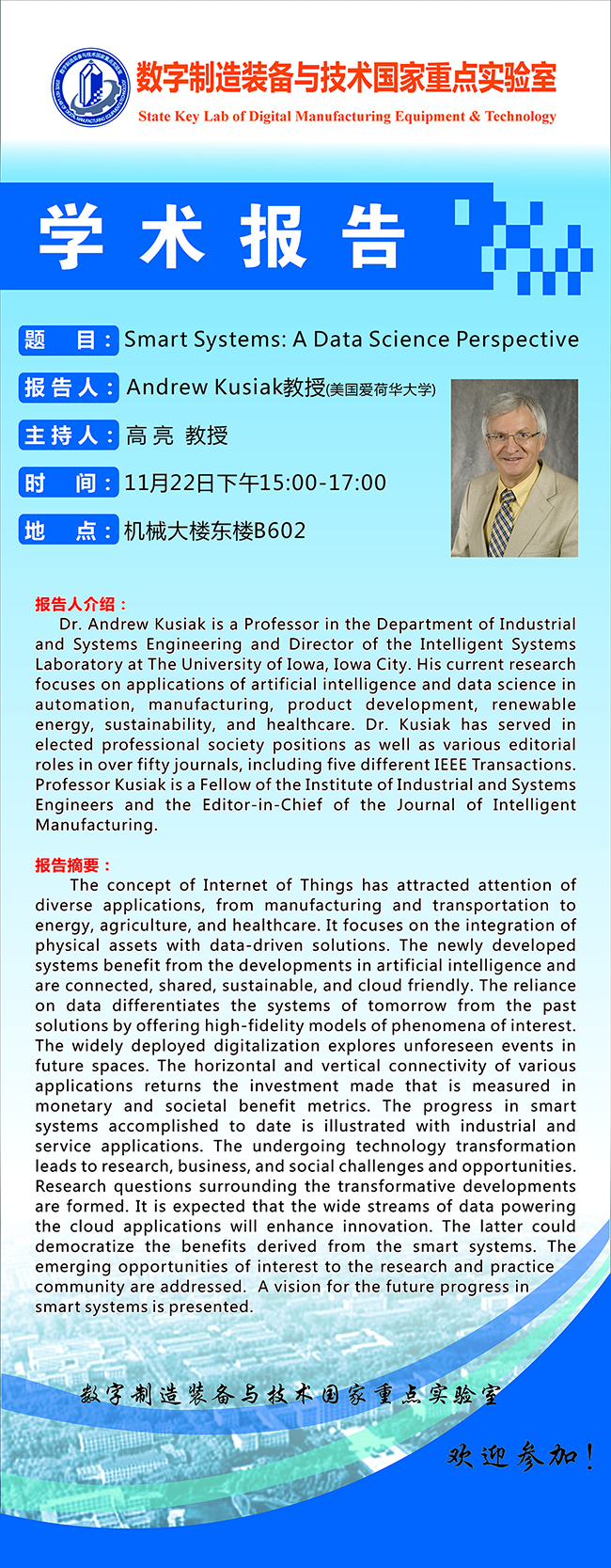 11.22 03:00PM 美国爱荷华大学Andrew Kusiak教授学术报告