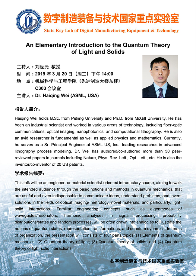 03.20 02:00PM 美国阿斯麦公司(ASML)尉海清博士学术报告