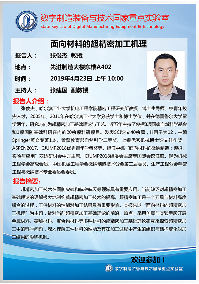 04.23 10:00AM 哈尔滨工业大学教授张俊杰学术报告