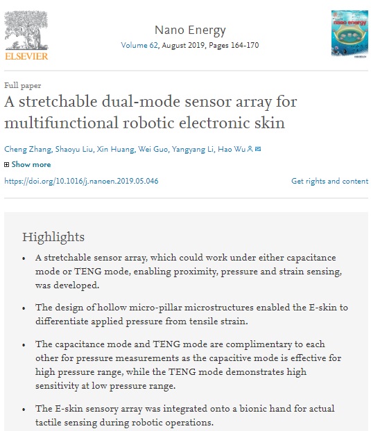 在“A Stretchable Dual-mode Sensor Array for Multifunctional Robotic Electronic Skin(一种用于机器人电子皮肤的多传感原理可拉伸传感器)”成果中表示,机器人电子皮肤是目前柔性电子领域的重要研究方向,针对现阶段大多数电子皮肤类传感器功能单一、测量区域窄、灵敏度低等问题,张成所在研究团队将摩擦发电式传感器在低压区域灵敏度高和电容传感器测量区域大的特点结合,首次提出基于电容和摩擦发电原理双模态传感机制的可拉伸传感器。该多功能传感器可以实现对压力、拉伸应变、定位距离和硬度等物理参数的检测,在<120KPa压力测量范围保持较高的灵敏度,同时还具备区分压力和拉伸载荷的能力。除此之外,本文还将传感器单元及阵列应用于仿生机械手的触觉传感和接近传感,能够识别出外部导体的三维形状,同时还能够区分不同材料的硬度。