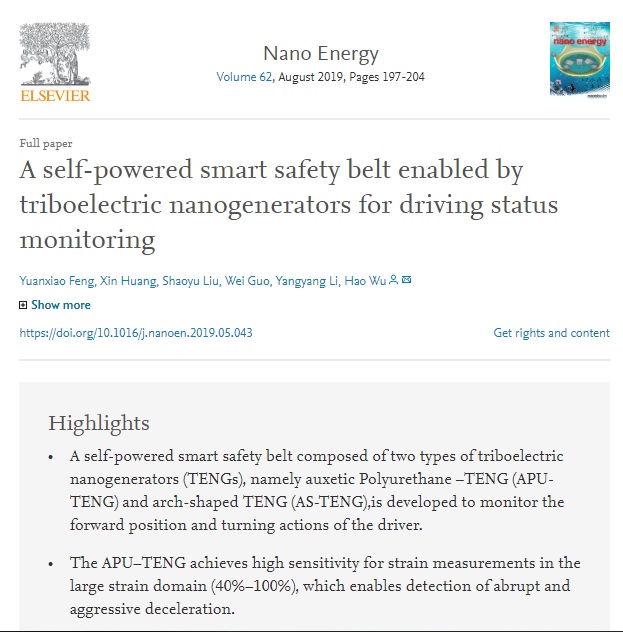 在 “A Self-powered Smart Safety Belt Enabled by Triboelectric Nanogenerators for Driving Status Monitoring(一种基于摩擦纳米发电传感器的用于驾驶状态监测的自供能智能安全带)”成果中提到,针对道路交通事故频发及应用于驾驶状态监测的微纳传感器件供能存在的挑战,冯元宵所在研究团队将摩擦纳米发电传感器集成于现有驾驶环境中,制备出一种自供能智能安全带,能够实时监测疲劳驾驶及激进驾驶等危险行为。一方面,综合负泊松比材料及摩擦纳米发电机的优点,研发了具备负泊松比性能的摩擦纳米发电传感器,其具有灵敏度高、响应速度快、应变测量区间大等特点,在40%~100%应变下灵敏度达到0.89V/cm2,能实时监测驾驶员的呼吸状态以及前倾位移,为疲劳驾驶的判别提供参考;另一方面,研发了翘曲型摩擦发电传感器,其开路电压与压缩距离具备良好的线性相关度,灵敏度高达47.2 V/cm3,开路电压峰值达到12.06V,响应时间为28ms,具有优异的线性度、稳定性及一致性,阵列化后集成于安全带上可以实时监测驾驶员的偏转方向及角度,为激进驾驶的判别提供依据。
