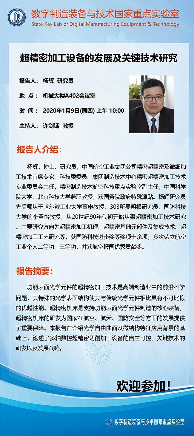 01.09 10:00AM 航空工业精密超精密及微细加工技术首席专家杨辉学术报告