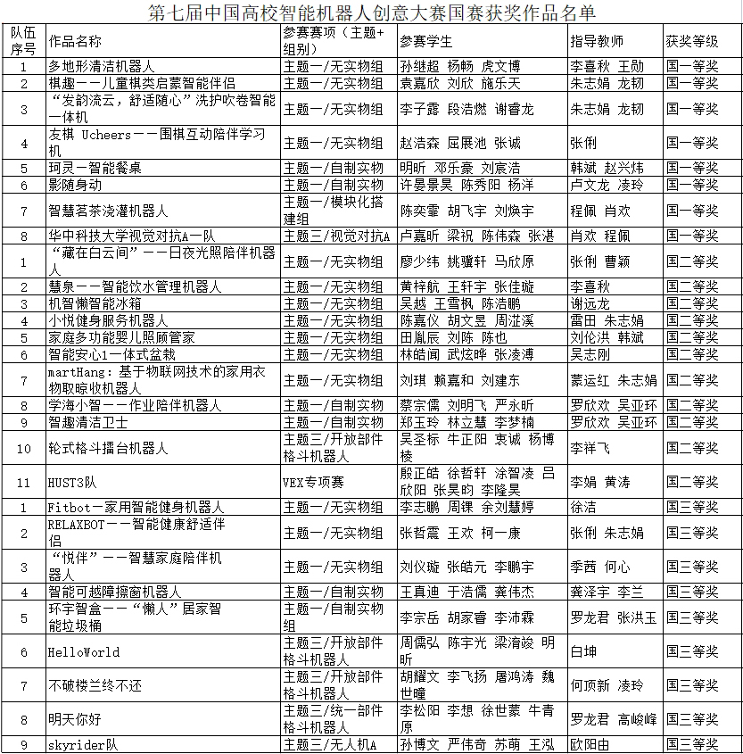 7月13日至14日,第三届湖北省高校智能机器人创意竞赛暨第七届中国高校智能机器人创意大赛湖北省区域赛在武汉工程大学流芳校区举行。我校学子在本届大赛中共获得省级一等奖27项,省级二等奖20项,省级三等奖3项。27支省级一等奖队伍全部晋级国赛,是去年晋级国赛队伍数量的1.5倍,创下历史新高。7月20日-21日,第七届中国高校智能机器人创意大赛VEX U专项赛初赛在华中科技大学举行。我校的四支VEX队伍参加角逐,其中HUST3队获得优秀设计奖,获得晋级国赛资格。
