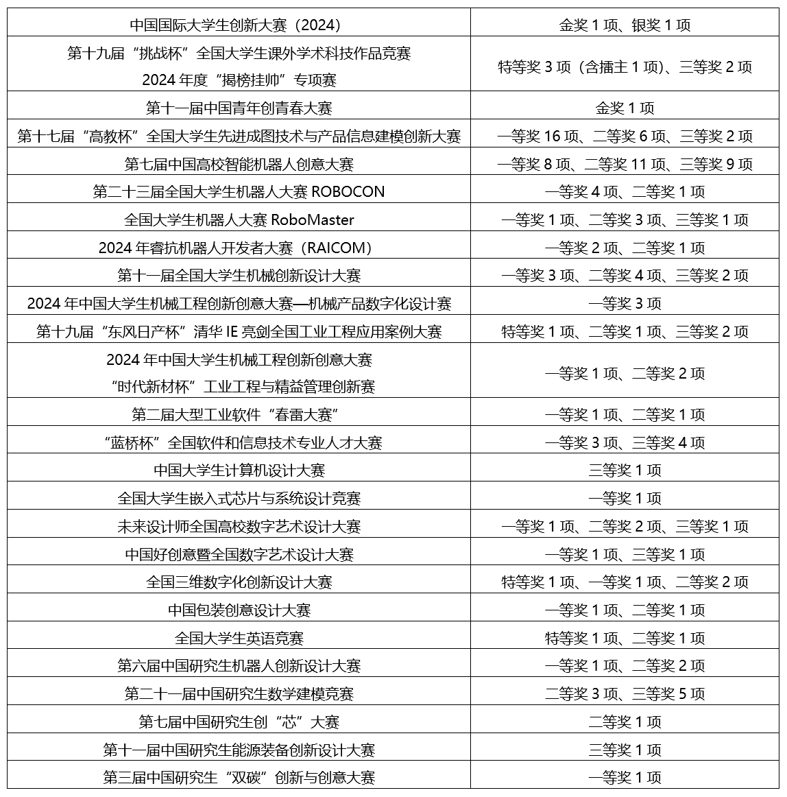 2024年,机械学子在各类创新创业大赛、学科竞赛中,用专业本领和青春热血努力书写青年有为、机械有为的时代答卷,共获省级以上奖项372项,覆盖1000余人次,其中,国家级一等奖及以上57项,“创新大赛”“挑战杯”“创青春”三大顶级A类赛事国家级奖项8项;大学生创新创业项目立项89项,获批国家级项目12项、省级项目38项;本科生以第一作者发表SCI/EI论文5篇,授权发明专利1项。